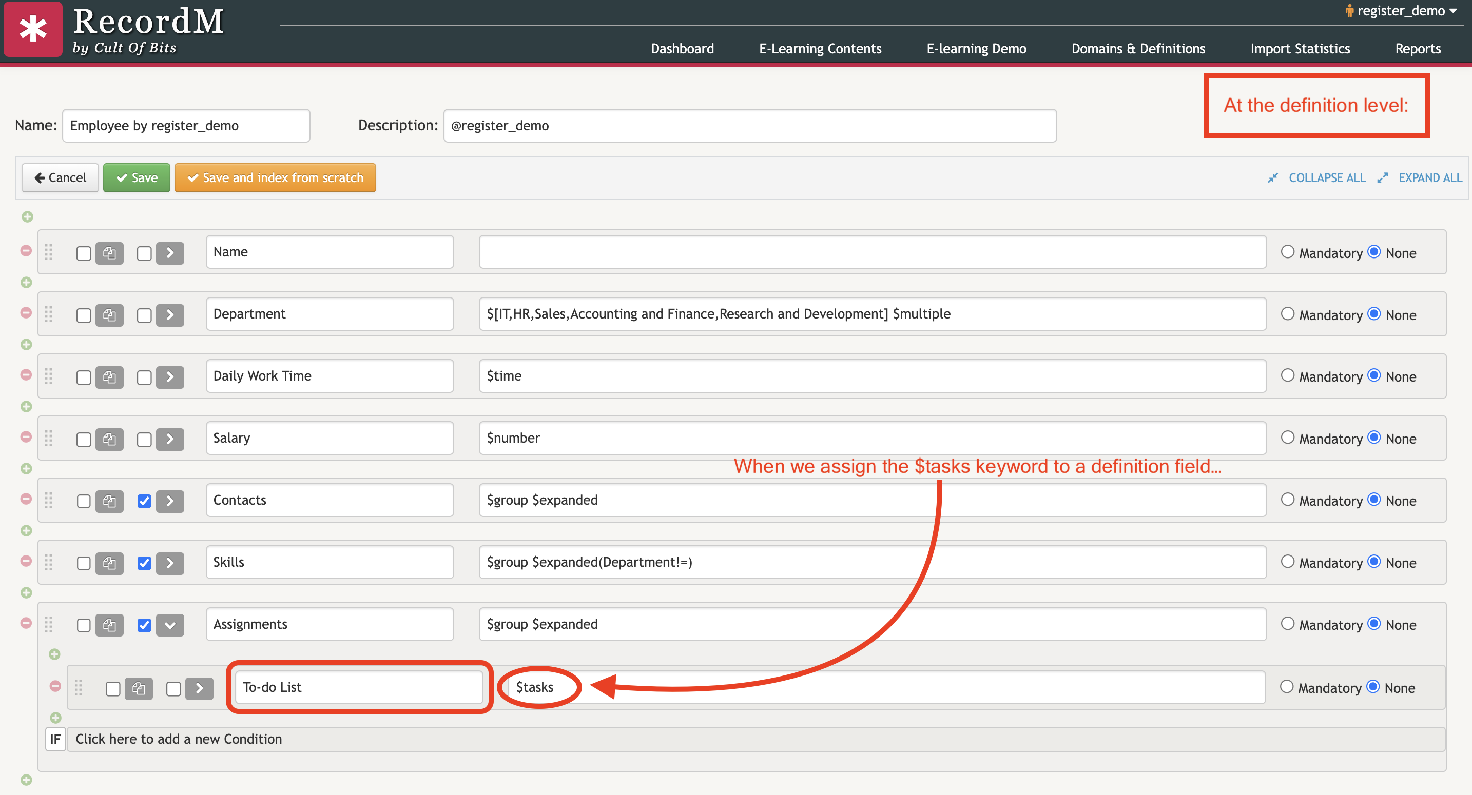 This keyword allows us to add a task that needs to be completed inside a definition record and assign it to a specific user.