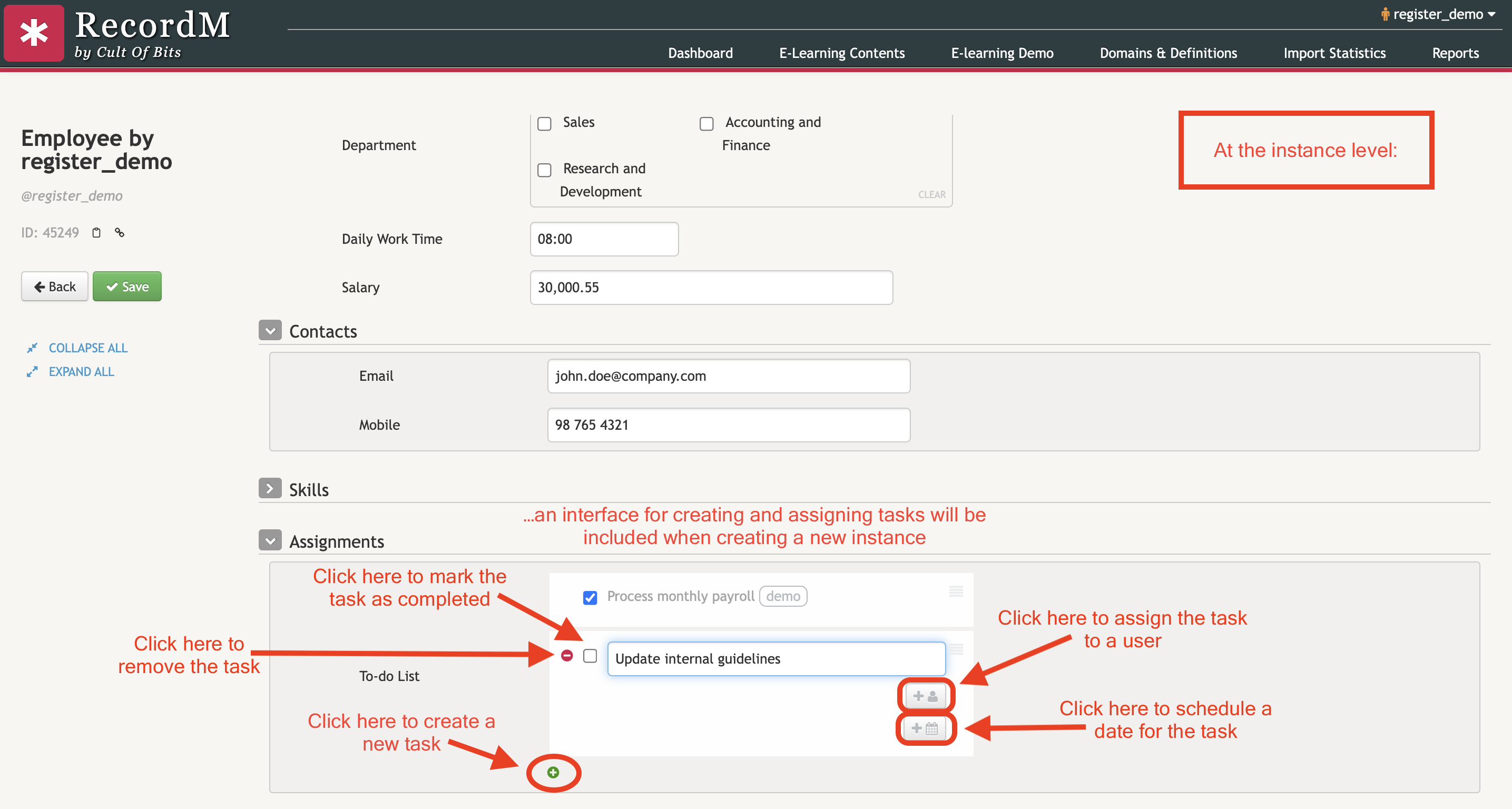 In the example displayed in the images below, we will add a new $tasks field and create a new task.