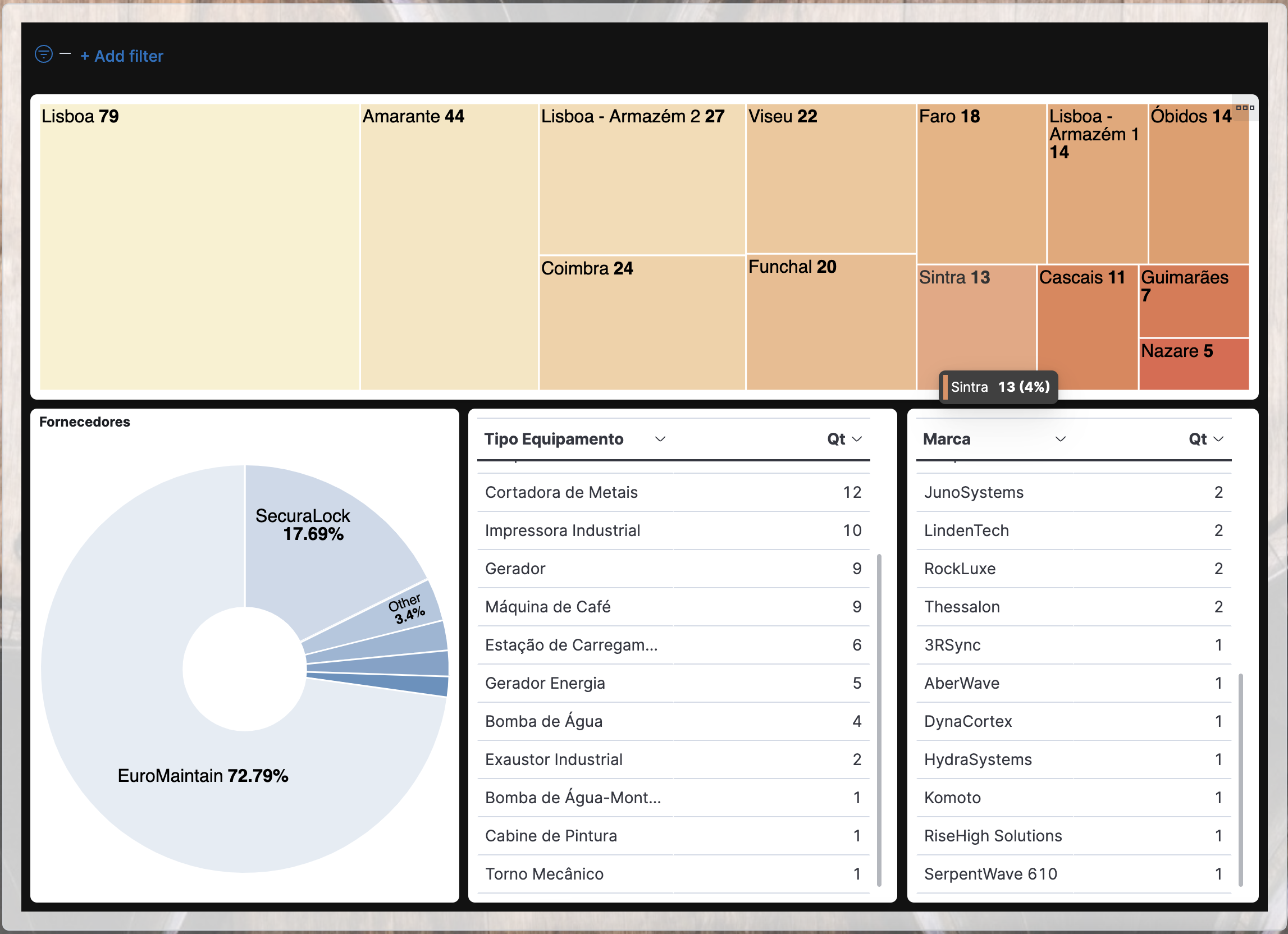 With all these components working together, we end up with a very powerful solution that will greatly facilitate the management of these Equipamentos for the company, allowing them to easily keep track of each ones location, type, brand, when the last check-up was, and when the next check-up is scheduled for. With the creation of this dashboard along with the properly thought-out definitions, this solution now provides a lot of value to this company, and the same thing can be done for a large variety of situations.